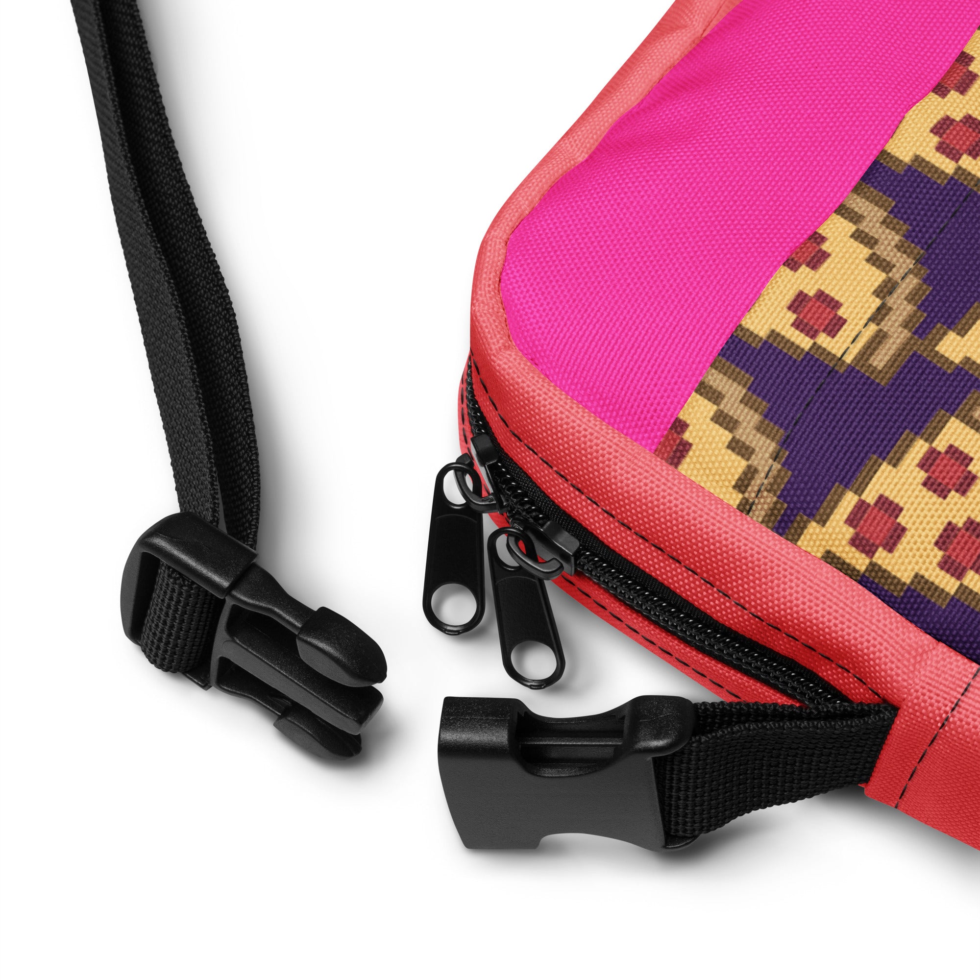 • 100% polyester • Fabric weight: 9 oz./yd.² (305 g/m²) • Bag size: 5.7″ × 7.7″ × 2″ (14.5 cm × 19.5 cm × 5 cm) • Capacity: 0.37 gallons (1.4 l) • Water-resistant and durable • Sturdy fabric with fusible backing to add firmness • Inside and outside pockets • Adjustable strap • Two-way zipper • Blank product components sourced from China